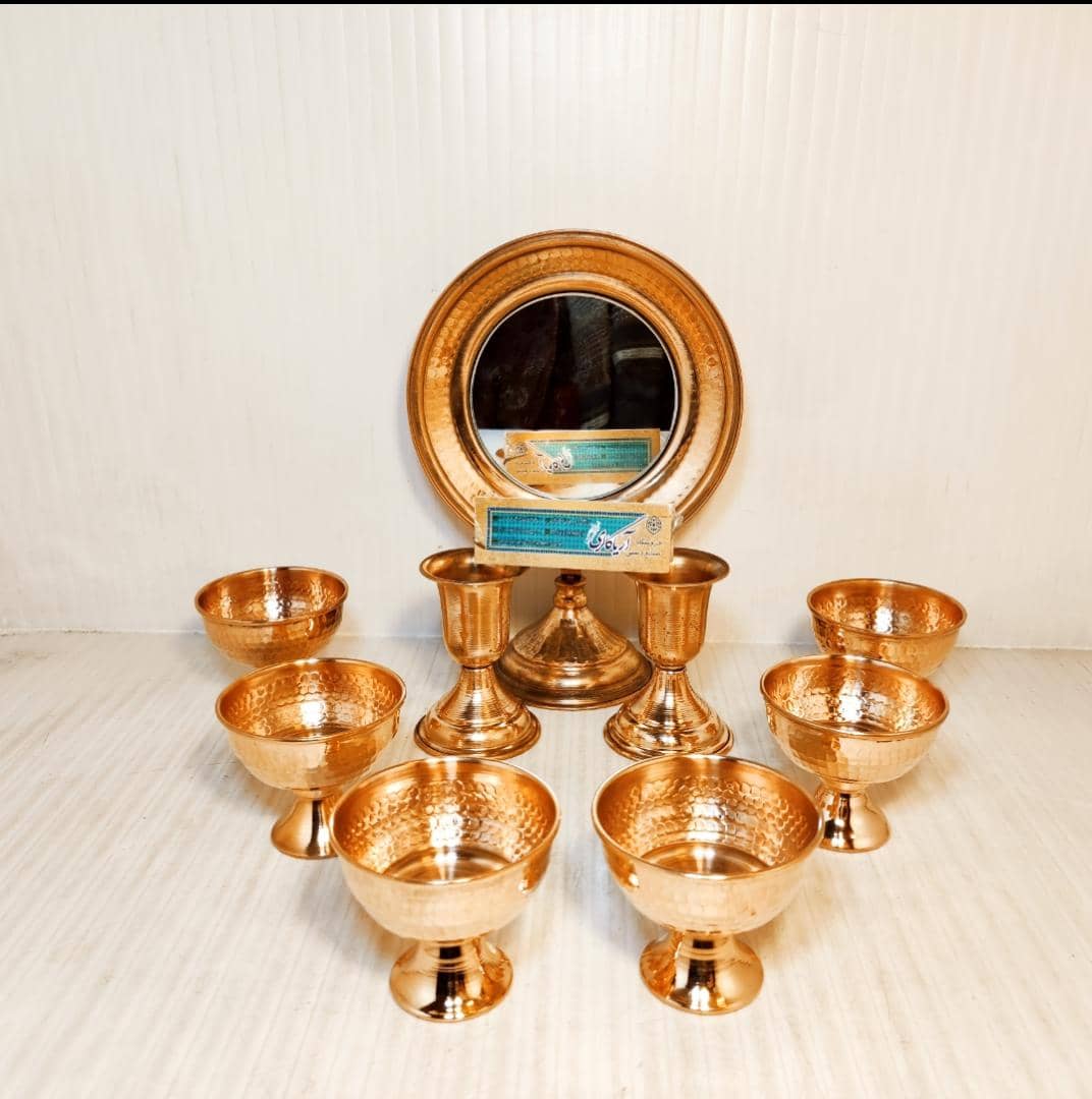 یکی از این ظروف زیبا که با رنگ مسی ارغوانی خود چشم نوازی خاصی به سفره شما می بخشد ،ست آینه و شمعدان و ۶ عدد جام مسی چکشی می باشد.